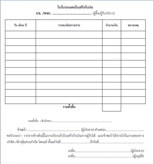 2.1.3 ใบรับรองแทนใบเสร็จรับเงิน ใช้ในกรณีที่กิจการจ่ายเงินค่าซื้อสินค้าหรือบริการเบ็ดเตล็ดแต่ไม่สามารถเรียกใบเสร็จรับเงินจากผู้ขายหรือผู้ให้บริการได้ ต้องให้พนักงานของกิจการเป็นผู้รับรองการจ่ายเงินดังกล่าว
